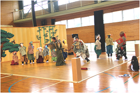 最初に、「狂言」について説明があり、「盆山」という演目を鑑賞しました。次に、1・2年が「狂言」での歩き方や声の出し方などを体験しました。最後に、演目 茸(くさびら)に3年生以上が中学生といっしょに出演しました。