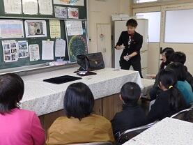 本日、放課後子ども教室は、マジシャンの工藤さんを招いて、マジックショーを行いました。カードマジックやコインマジックなど、いろいろな種類の見せてもらいました。目の前に起こる不思議なことに、子どもたちはただただ驚くばかりでした。