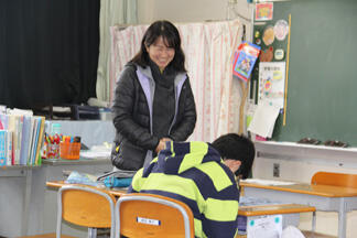 6年生は小学校最後の版画制作に取り組んでいます。思い出の校舎をバックに熊野江小の仲間たちが笑顔いっぱいの構図です。