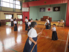 7月17日(金)、放課後子ども教室でなぎなた教室がありました。今回が最後のなぎなた教室です。正式に袴を着て、なぎなたの基本動作(上段、中段、下段、八相の構え)を練習しましたが、1年生もなぎなたの振り方が上手になってきました。
