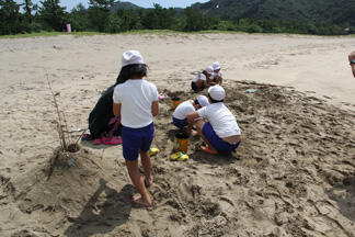 今回の土曜授業は、「海で遊ぶ・泳ぐ活動」です。台風11号の影響で、海で泳ぐ活動は中止になり、「砂の造形」だけを行いました。