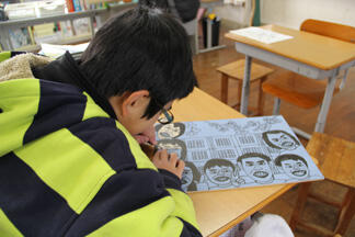 6年生は小学校最後の版画制作に取り組んでいます。思い出の校舎をバックに熊野江小の仲間たちが笑顔いっぱいの構図です。