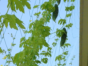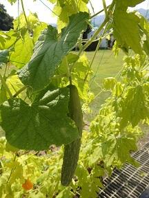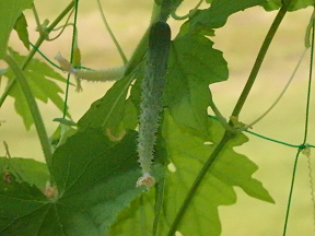ゴーヤは手の届かないところに大きな実をつけています。収穫がたいへんです。 キュウリも順調に生長しています。