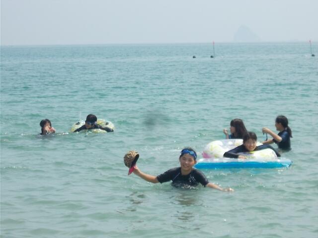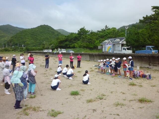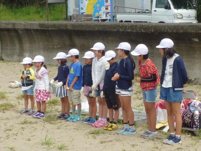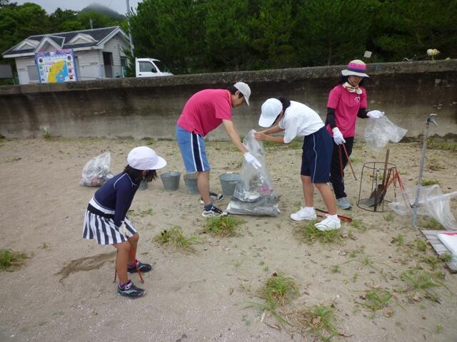7月1日(土)に熊野江海岸(海水浴場の海開きに向けて)の清掃に参加しました。地区の方と一緒に砂浜のゴミ拾いを行いました。流木や海草類等がたくさんありましたが、その中に空き缶やペットボトル、ゴム製品等の人工物のゴミも混ざっていました。捨てた人がいたのだと思うと、少し残念でした。気持ちよく海開きが迎えられそうです。