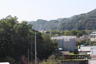 点検も兼ねて、屋上に登ってみました。下の写真は、左が学校から西側の鏡山方面、2枚目が北側の北浦方面、そして3枚目が南の海側です。現在塗装工事中の中学校の向こうに、ほんの少しだけ海が見えています。