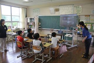 オンラインによる授業を見据えて、オンラインで朝の会を行いました。浦城小学校の友だちの顔が画面に見えるとみんな大興奮でした。