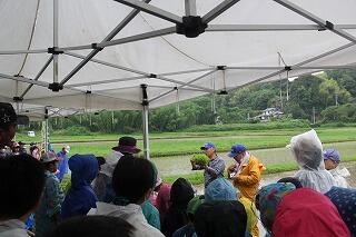 ※田んぼに着いたら、田植えの方法についての説明を聞きます。そして、さあ田植えです。