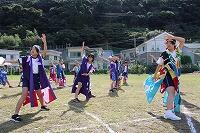神社からご神体が入った神輿が下ろされた後、小学生は1・2年生のダンス、3年生以上はソーラン節で祭りを盛り上げました。