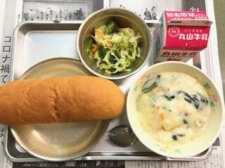 1月26日(火)の給食 投稿日時 : 2021/01/27 学校管理者 カテゴリ:今日の給食 揚げパン 牛乳 つくねと春雨のスープ アーモンドサラダふわふわの揚げパンでした。今日もご馳走さまでした。また、今日はいつも美味しいパンを作ってくださる三島パンの方に感謝のお手紙を渡しました。給食の配送もしてくださり、感謝でいっぱいです。