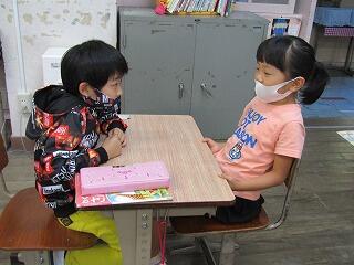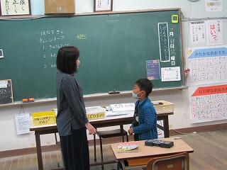 1年生は、「チェンジトーク」で、「1 昨日したこと」「2 わたしのかぞく」「3わたしのゆめ」について、話し手と聞き手に別れて会話を行う練習をしていました。