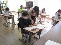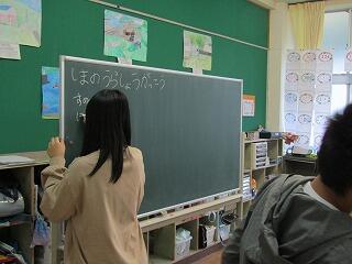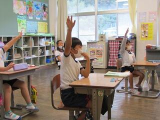 2年生は、聞いて話すという活動でした。まず、好きな食べ物について全員発表した後、「○○さんが好きな食べ物は何でしたか?」と教師が質問し、子どもたちが答えるという内容でした。しっかりと話を聞いていないと答えられません。全員手を挙げて答えることができていました。