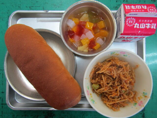 今日は、減量コッペパン、牛乳、ミートソーススパゲティ、フルーツポンチです。