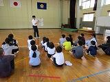 あいにく天候が悪く体育館で行われましたが、3校時には1年生が保育園児と一緒に道路の歩き方、道路の横断の仕方を、4校時には3~6年生が自転車の乗り方を学びました。