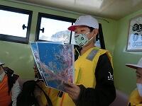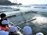 次は、船に乗って島をクルージング。「メキシコ女王の墓」や自然にできた海上トンネル「鼻熊」を見て回りました。また、海の中に生息しているサンゴも箱メガネを使って見ることができました。さらに、養殖されているカンパチのえさやりも体験しました。えさに群がる大きなカンパチの様子を見て、子どもたちも興奮していました。