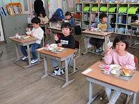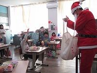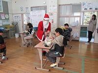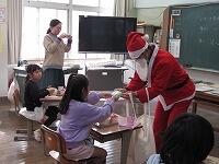 最後の給食は、お楽しみ給食ということで、子どもたちが選んだデザートが付いていました。デザートは、給食時間に直接サンタさんから渡していただきました。子どもたちは、サンタの登場に声も出ないくらい驚いていたようですが、うれしそうにデザートを受け取っていました。その後、おいしそうにデザートを食べていました。