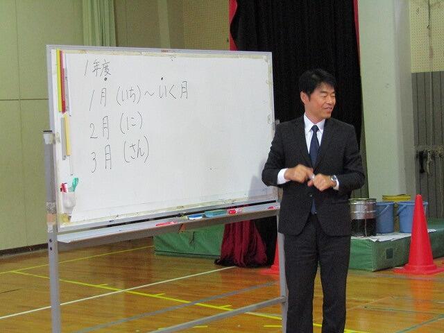2月の全校朝会では、校長先生は桜が春の準備をする様子について、生徒指導担当の先生は2月の目標「外で元気に運動しよう」について、お話をしました。