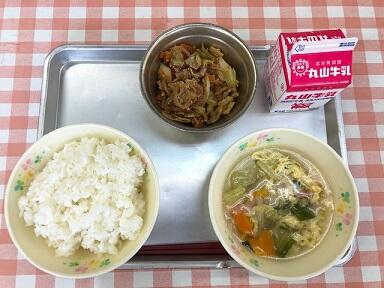 白ご飯 牛乳 チンジャオロース ニラ玉スープ