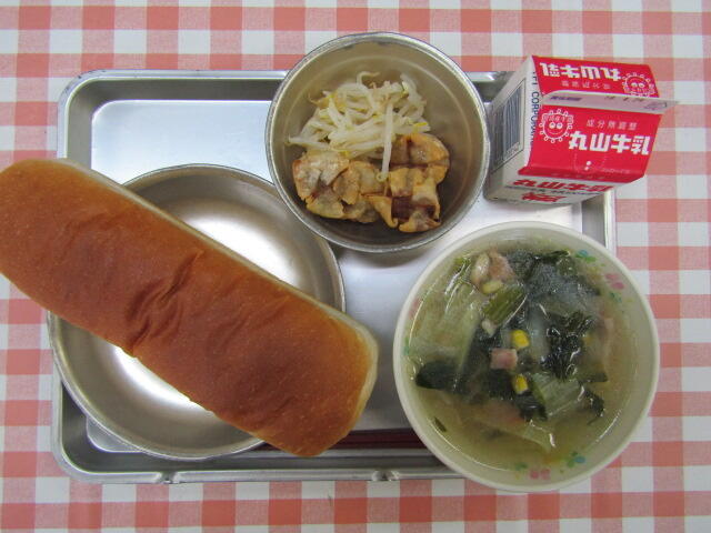 今日は、コッペパン、牛乳、野菜スープ、揚げシュウマイ、ゆでもやしです。