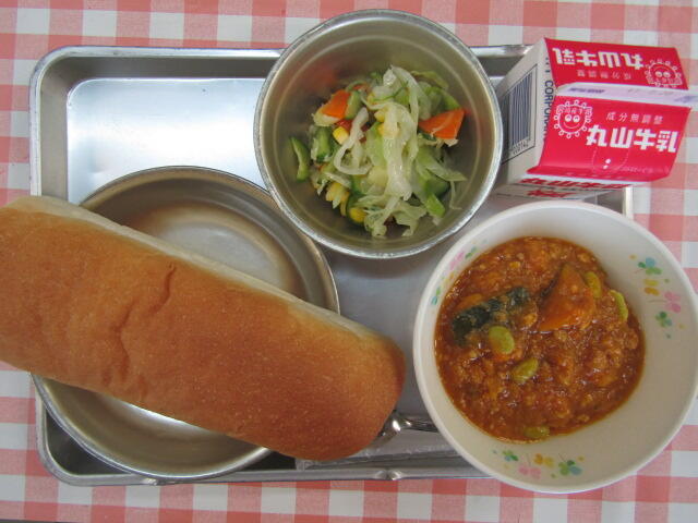 今日は、コッペパン、牛乳、かぼちゃのミートソース、フレンチサラダでした。