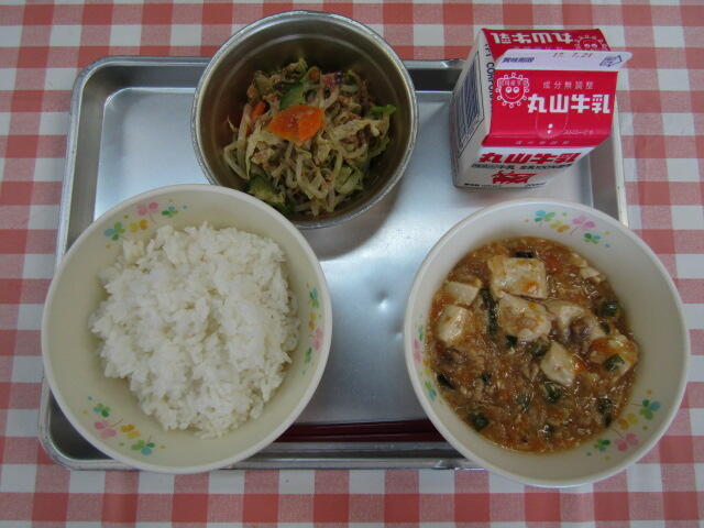 今日は、ごはん、牛乳、マーボーどうふ、おかか和えです。