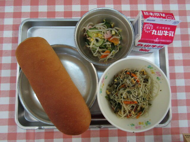 今日は、減量コッペパン、牛乳、高菜ビーフン、もやしのナムルです。