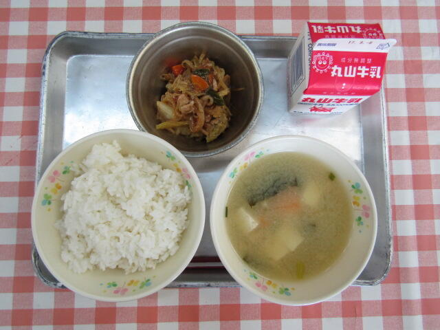 今日は、ごはん、牛乳、みそいため、にら玉汁です。