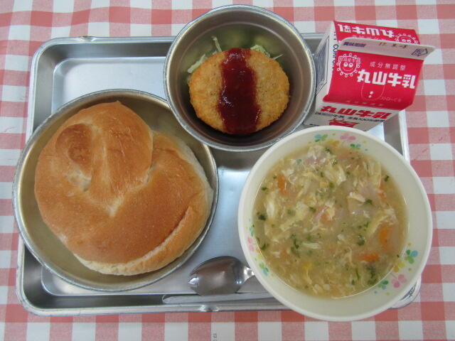 今日は、バーガーパン、牛乳、日向鶏コロッケ、ゆでキャベツ、コーンスープです。