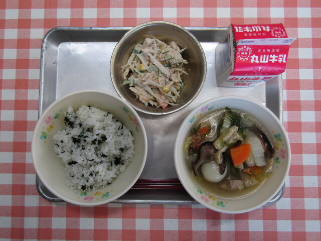 今日の献立は「わかめごはん 牛乳 雑煮 かみかみごぼうサラダ」