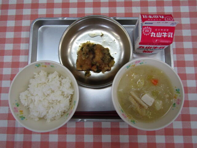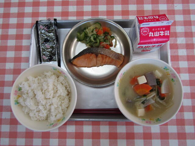 今日の給食は「麦ごはん 牛乳 みそけんちん汁 鮭塩焼き かりかり和え 味付けのり」です。