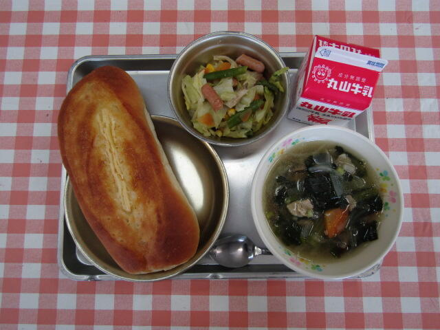 今日の献立は「コッペパン りんごジャム 牛乳 コーンスープ ほうれん草オムレツ そえ野菜」です。