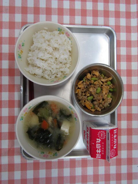 今日の献立は「ごはん 牛乳 鶏そぼろ丼 豆腐のみそ汁」です。