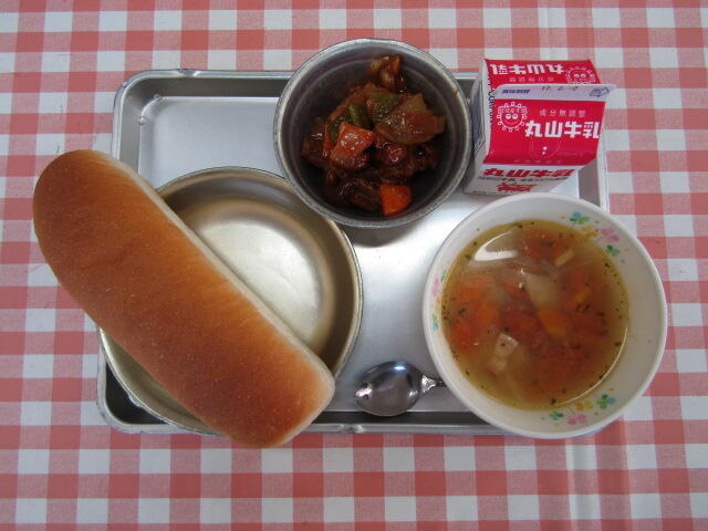 今日の献立は「コッペパン 牛乳 トマトと玉ねぎのスープ 鶏肉とカシュナッツの炒め煮」