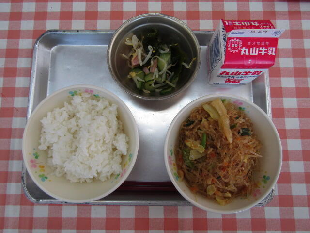 今日の給食は「ごはん 牛乳 麻婆春雨 もやしのナムル」です。