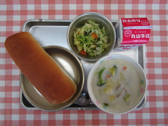 今日の献立は「コッペパン 牛乳 白菜のクリーム煮 アーモンド和え」です。