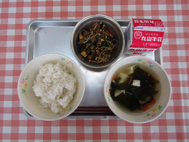 今日の献立は「麦ごはん 牛乳 ビビンバ わかめスープ」です。