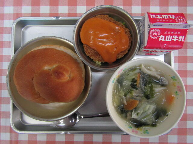 今日は、バーガーパン、牛乳、あげみバーガー、マロニースープです。