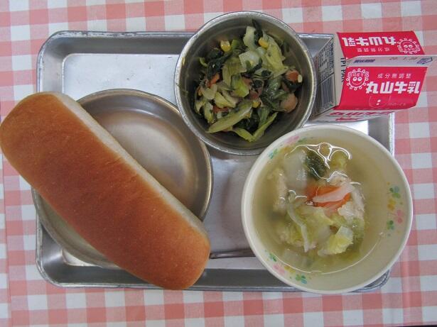 今日は、コッペパン、牛乳、肉団子スープ、ほうれん草とウインナーのソテーです。