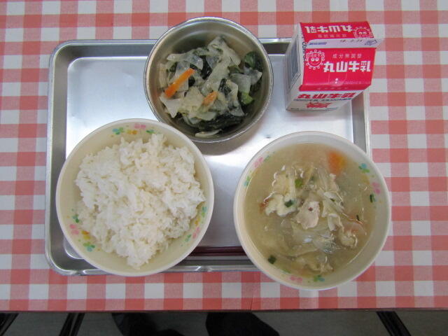 今日は、ごはん、牛乳、豆腐だんご汁、すみそあえです。
