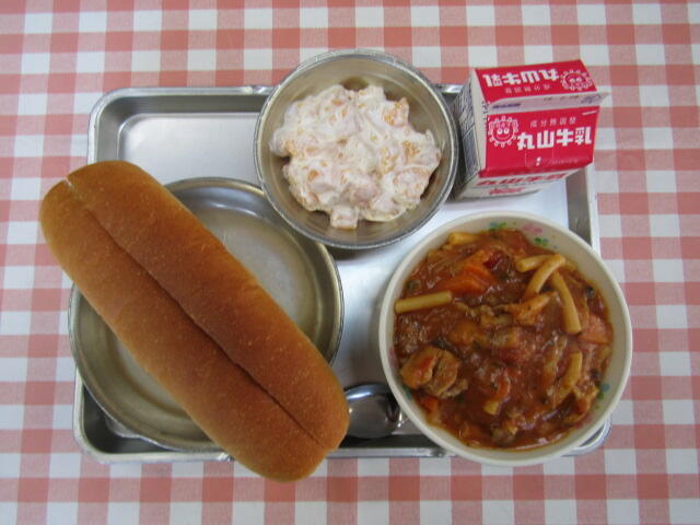 今日は、背割れパン、牛乳、鶏肉とじゃがいものトマト煮、クリーム和えでした。