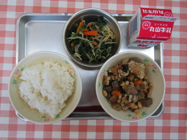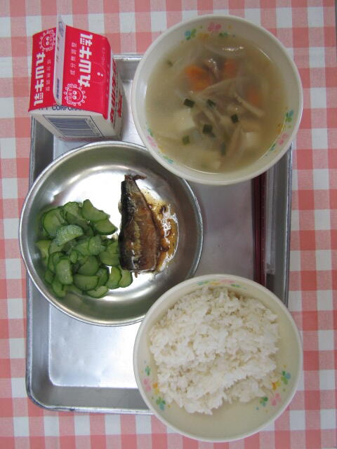 今日は、麦ごはん、牛乳、けんちん汁、いわしの梅煮、ゆできゅうりです。