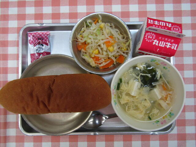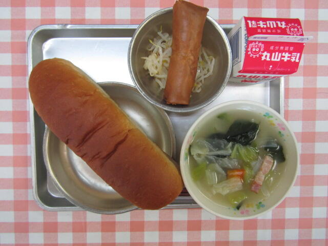 今日は、黒糖パン、牛乳、野菜スープ、春巻き、ゆでもやしです。
