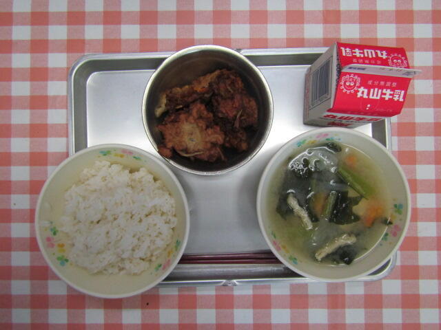 今日は、ごはん、牛乳、小松菜のみそ汁、香味揚げです。