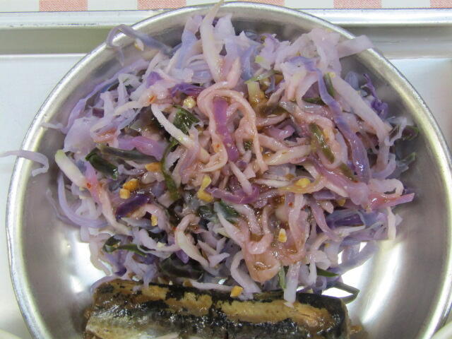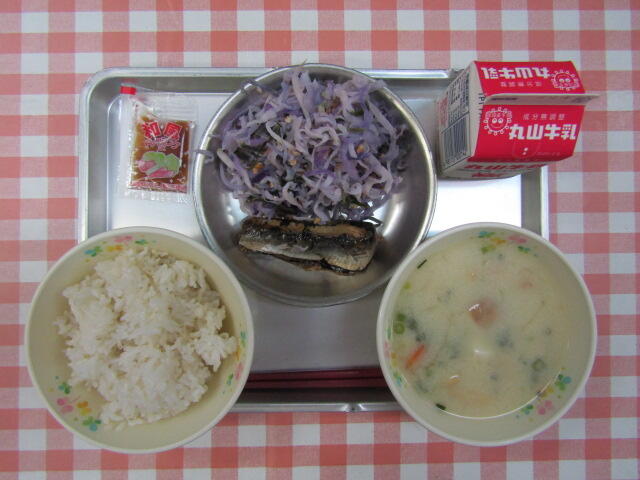 12月3日 投稿日時 : 2018/12/03 学校管理者 今日は、麦ごはん、牛乳、いわしの梅煮、千切り大根変身サラダ、呉汁です。今日のサラダは、変身サラダという名前の通り、ドレッシングをかけると…少しピンク色に変わっているのがわかるでしょうか?紫キャベツのアントシアニンという色素に酸性が加わるとピンク色に変わるという反応です。