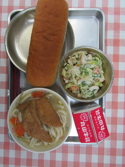 12月13日 投稿日時 : 2018/12/13 学校管理者 今日は、揚げパン、牛乳、塩こうじスープ、フルーツミックスです。フルーツミックスには、ひし形に切られた豆乳プリンが入っています。揚げパンは、センターでパンを揚げてきな粉をまぶし、一つ一つ袋に入れています。スープには、塩こうじとショウガが入っているので、体が温まりました。