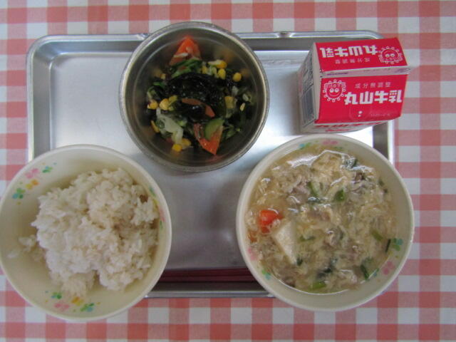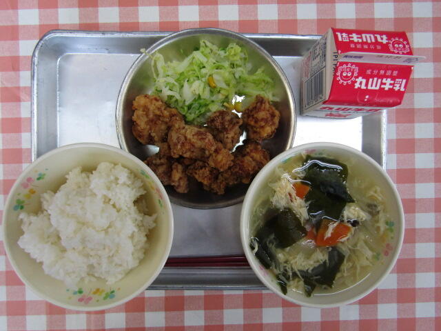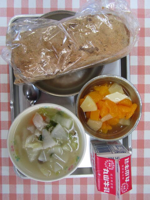12月13日 投稿日時 : 2018/12/13 学校管理者 今日は、揚げパン、牛乳、塩こうじスープ、フルーツミックスです。フルーツミックスには、ひし形に切られた豆乳プリンが入っています。揚げパンは、センターでパンを揚げてきな粉をまぶし、一つ一つ袋に入れています。スープには、塩こうじとショウガが入っているので、体が温まりました。