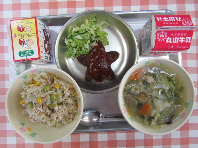 12月19日 投稿日時 : 2018/12/19 学校管理者 今日は、クリスマスお楽しみ給食でした。当日まで子どもたちには献立内容は秘密にしていたので、朝から「今日の給食なんですか?」とたくさん聞かれました(*^^)楽しみにしてくれていたようで、とてもうれしかったです。サケと青豆のまぜごはん、牛乳、スターハンバーグ、そえ野菜、マロニースープ、クリスマスデザートです。