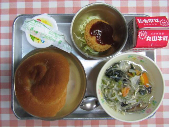 今日は、メンチカツバーガー、牛乳、チンゲン菜スープ、レモンゼリーです。