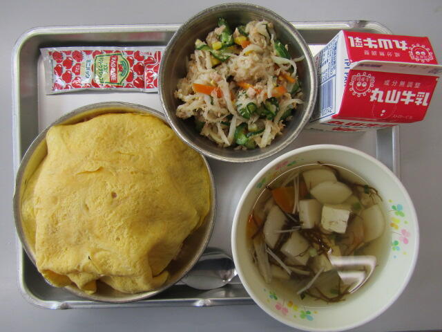 10月26日 投稿日時 : 2018/10/26 学校管理者 今日は、セルフオムライス、牛乳、もずくスープ、千切り大根のサラダです。今日は、オムライスにケチャップで絵を書いてオリジナルのオムライスづくりをしました。子どもたちは、素敵な絵を書いていました。楽しそうな様子が見れてうれしかったです。