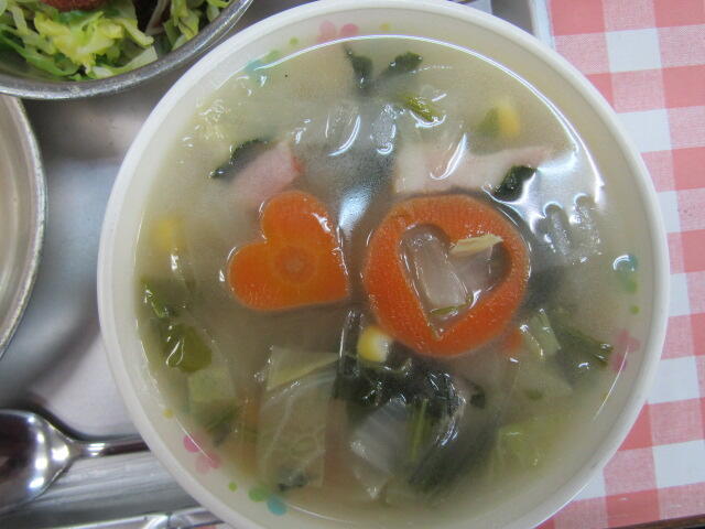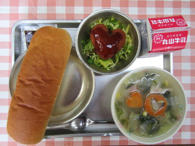 2月14日 投稿日時 : 2019/02/14 学校管理者 今日は、コッペパン、牛乳、コロッケ、ゆでキャベツ、野菜スープ、チョコクリームです。今日は、バレンタインデーなので、ハートの形のコロッケです。調理員さん方が野菜スープのにんじんをハートに型抜きしてくださいました。子どもたちへのサプライズでとっても嬉しかったです。子どもたちもうれしそうに「ハートが入ってました♥」と話してくれました。