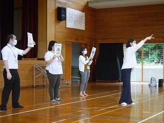 水泳の学習はもう少し先ですが、いついかなる時に緊急事態が生じるか分かりません。子ども達や地域の方々の安全のために、心肺蘇生法(AED使用法)の研修を行いました。研修には、延岡市消防本部から講師を招いて、職員全員が90分間にわたって座学から講義までしっかりと学びました。